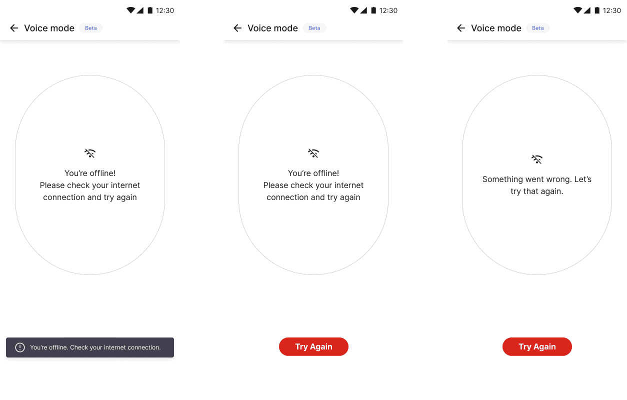 Static screens are easy to design. What Voice Mode actually needed was a system of motion that communicated three distinct states — idle, active, processing — through changes in the oval's feel without ever being distracting. The principle we kept returning to was "motion with intent." Every transition had to serve a communicative purpose: state change, feedback, or emotional tone.