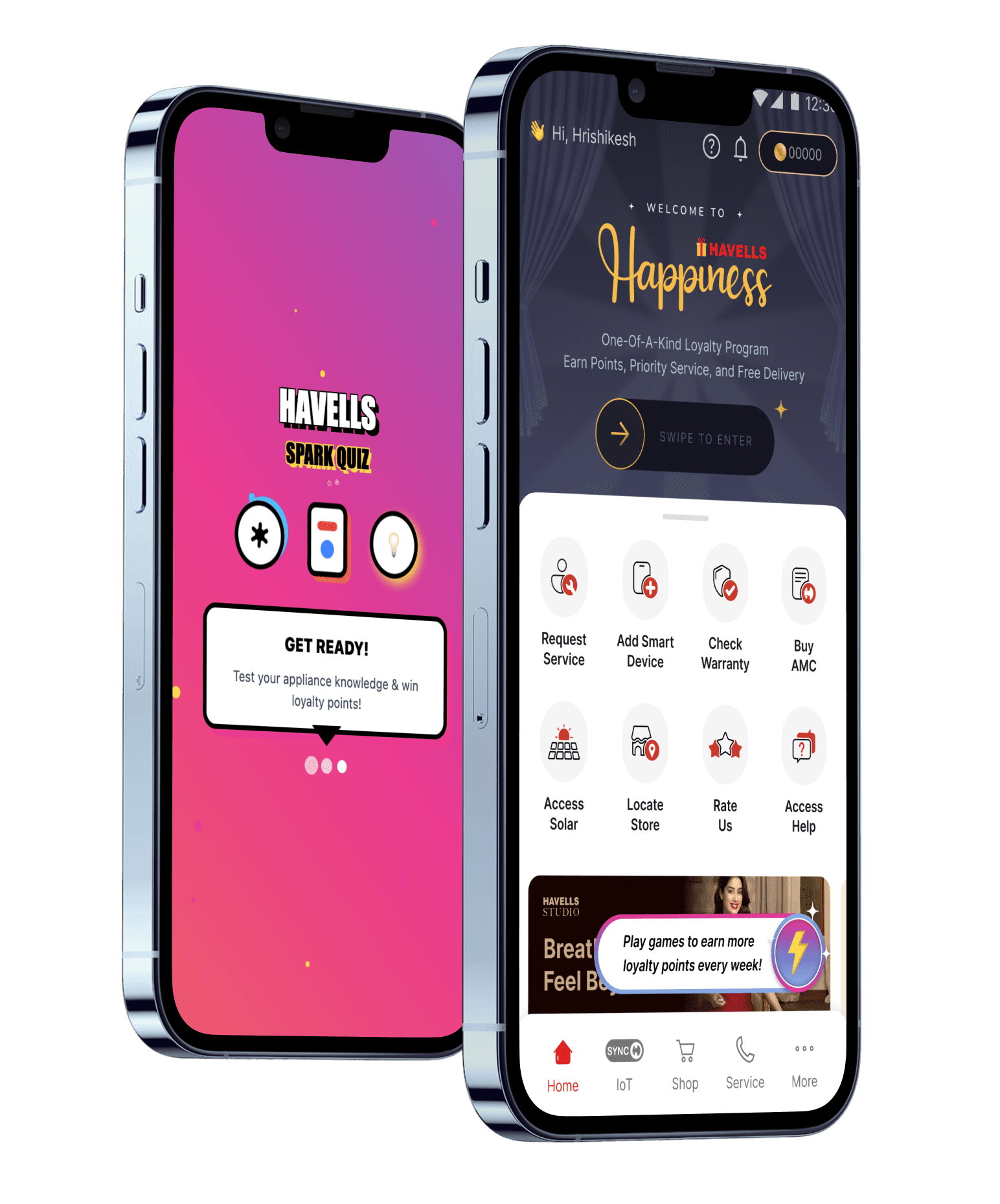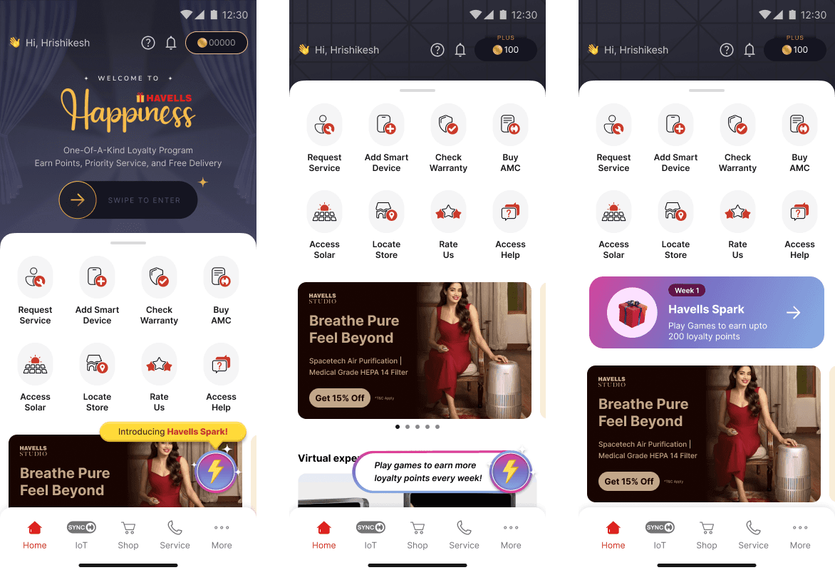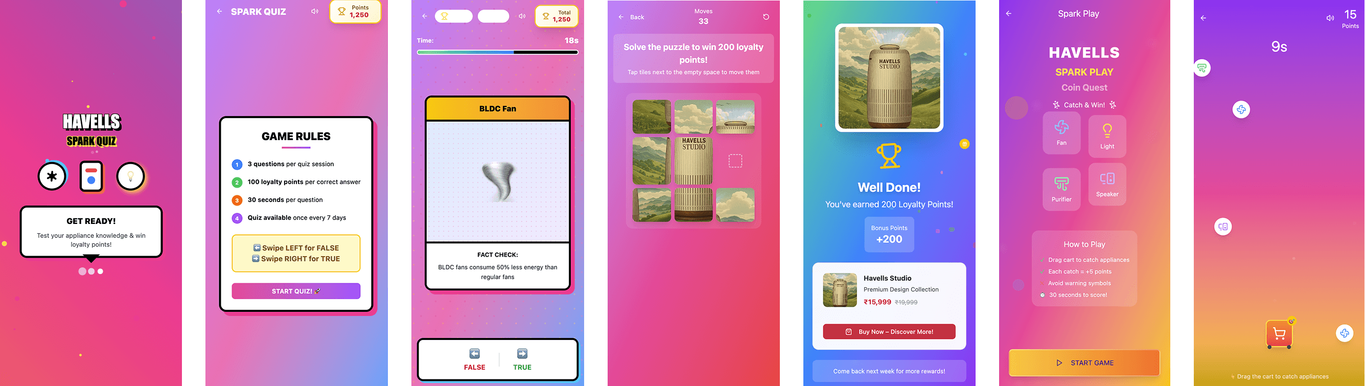 To increase repeat usage, I designed gamified engagement mechanisms that encourage users to return to the app through lightweight, rewarding interactions. Using vibe coding and Figma make Ai, I explored game-based concepts where users earn loyalty points on each visit - creating a clear incentive loop tied to real value through purchases on the Havells app and ecosystem. This approach balanced user motivation with business goals of improving retention, frequency, and long-term engagement.