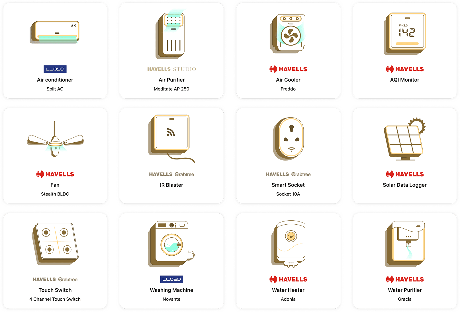 The device card illustration system shipped as a scalable asset library, covering [X] device types and establishing a visual language for hardware representation that has since been extended across other surfaces in the Havells One App.